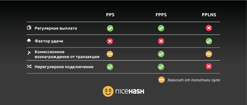 С помощью методов оплаты PPS, FPPS и RTPPS вы будете получать оплату независимо от того, найдет ли пул блок или нет. Это самое большое преимущество над PPLNS. С другой стороны, PPLNS позволяет вам в какой-то мере «играть в азартные игры». Если ваш ордер отправляет мощность на пул, на котором в это время находится большой блок, вы, скорее всего, заработаете намного больше, чем на пуле с PPS, FPPS или RTPPS.