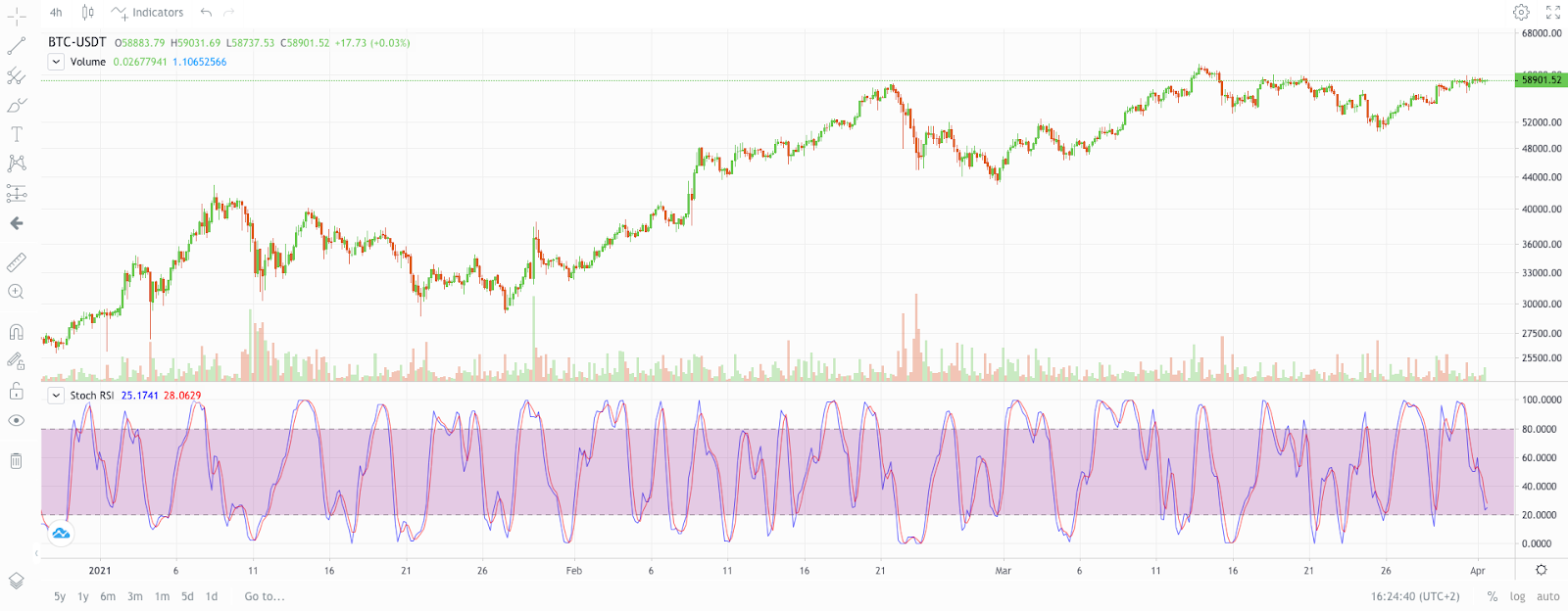 当Stoch RSI跌至0.20以下时,通常认为资产已超卖;如果RSI高于0.80,则认为资产已超买(取值为0到100的范围时,则低于20时价格超卖,而高于80时价格超买)。