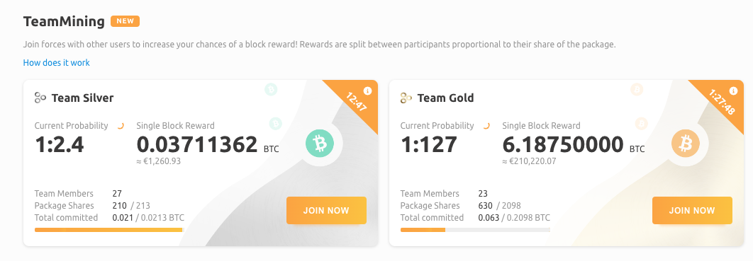 EasyMiningでは、他のマイナーのハッシュパワーにアクセスできるパッケージを購入してマイニングを行うことができます。ブロックをキャッチすると、ブロック全体の報酬を獲得することができます。