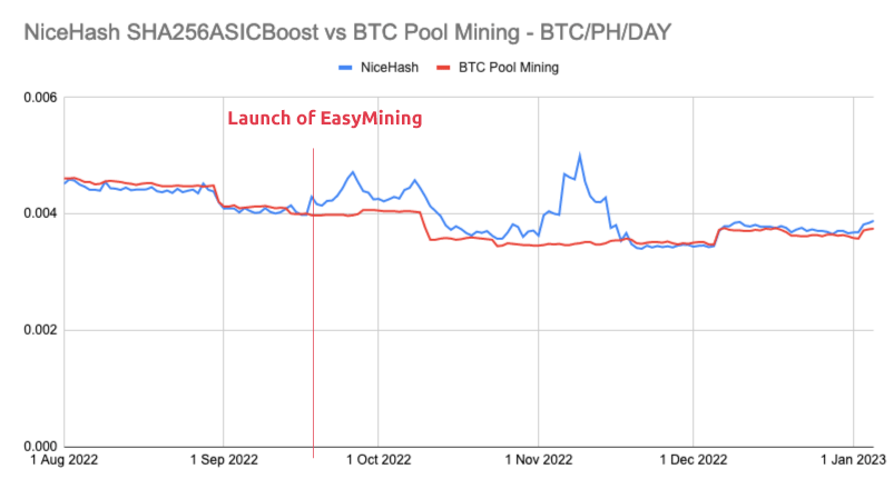 NiceHash于2022年9月23日推出了EasyMining,从那时起,NiceHash的平均支付的价格比直接到矿池挖矿高出6.4%左右,偶尔甚至会有超过40%的利润峰值!记住,NiceHash是一个算力市场,买家在这里相互竞争,这就是为什么价格会存在波动。