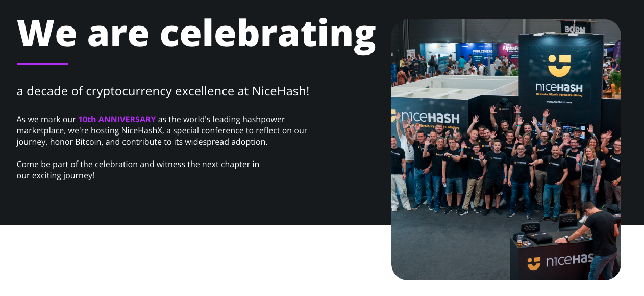 NiceHash Bitcoin Conferenceは、弊社設立10周年を祝うとともに、暗号通貨分野で最も優秀な頭脳を一堂に集め、学習、ネットワーキング、イノベーションのための前例のない機会を提供することを目的としています。暗号通過分野のリーディングカンパニーとして、NiceHashはビットコインのエコシステムにおける教育、普及、コミュニティの育成に尽力しています。このカンファレンスは、ビットコインマイニング、取引、日常ユーザーやビジネス向けのビットコイン決済ソリューションの最新トレンド、テクノロジー、戦略を探求するプラットフォームとして機能します。