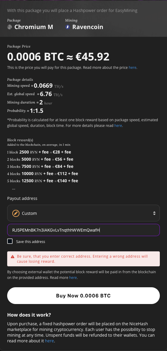 Haz clic en un paquete para ver qué moneda está minando. Actualmente, puede ser Bitcoin (BTC), Bitcoin Cash (BCH), Litecoin (LTC), Dogecoin (DOGE), Ravencoin (RVN) o Kaspa (KAS). Elige el tipo de paquete que deseas probar, ingresa la dirección de tu monedero donde quieres recibir las recompensas de bloque y haz clic en 'Comprar Ahora'.