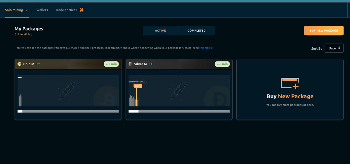 Una vez comprado el paquete, aparecerá en la parte superior de la sección 'Paquetes Activos'. Cada paquete te otorga una cantidad fija de hashrate y puede durar entre 1 y 4 horas, dependiendo del paquete elegido. La barra de progreso te mostrará qué tan cerca estás de minar un bloque.