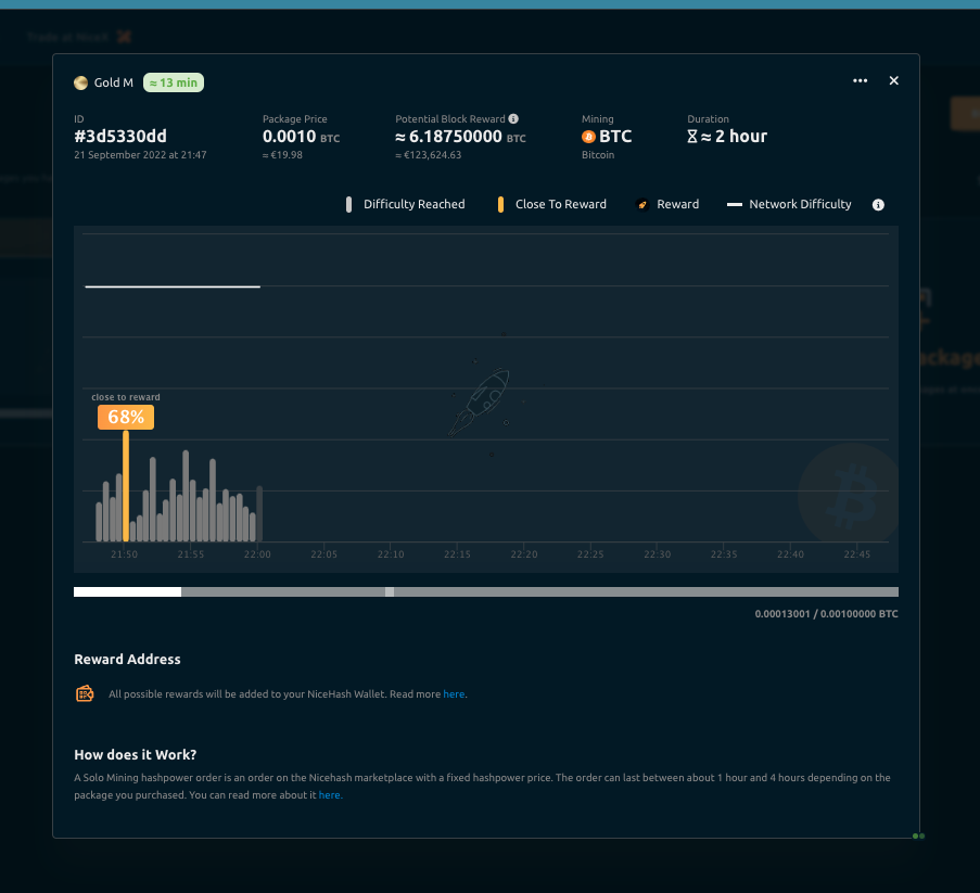 La línea negra en la parte superior representa la Dificultad Global de la Red. Puedes leer más sobre la dificultad y cómo funciona EasyMining aquí. Debajo, verás una barra de progreso gris que avanzará con el tiempo. Esta barra indica el hashrate (o 'velocidad') de tu paquete. Si la barra se vuelve amarilla, significa que estás cerca de minar un bloque, y el porcentaje mostrará qué tan cerca estuviste. Si logras minar uno, verás un icono de cohete en la parte superior de la barra amarilla. Para más información sobre el gráfico, haz clic aquí.