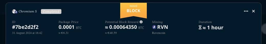 Your package will display a yellow sign and say ‘Mined Block!’ and you will also be able to see it on the package's mining graph as a yellow bar with a rocket symbol on the top.