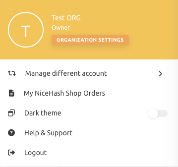Для удаления организации вам сперва необходимо войти в свою учетную запись NiceHash и в организацию, которую вы хотите удалить.